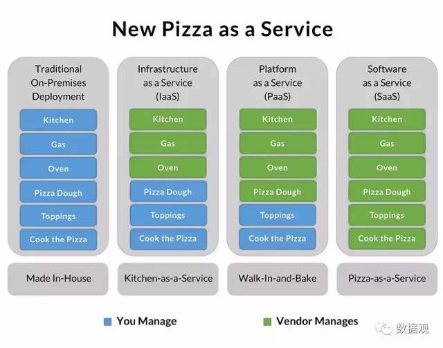 你可以從頭到尾,自己生產(chǎn)披薩,但是這樣比較麻煩,需要準(zhǔn)備的東西多,因此你決定外包一部分工作,采用他人的服務(wù)。你有三個方案: