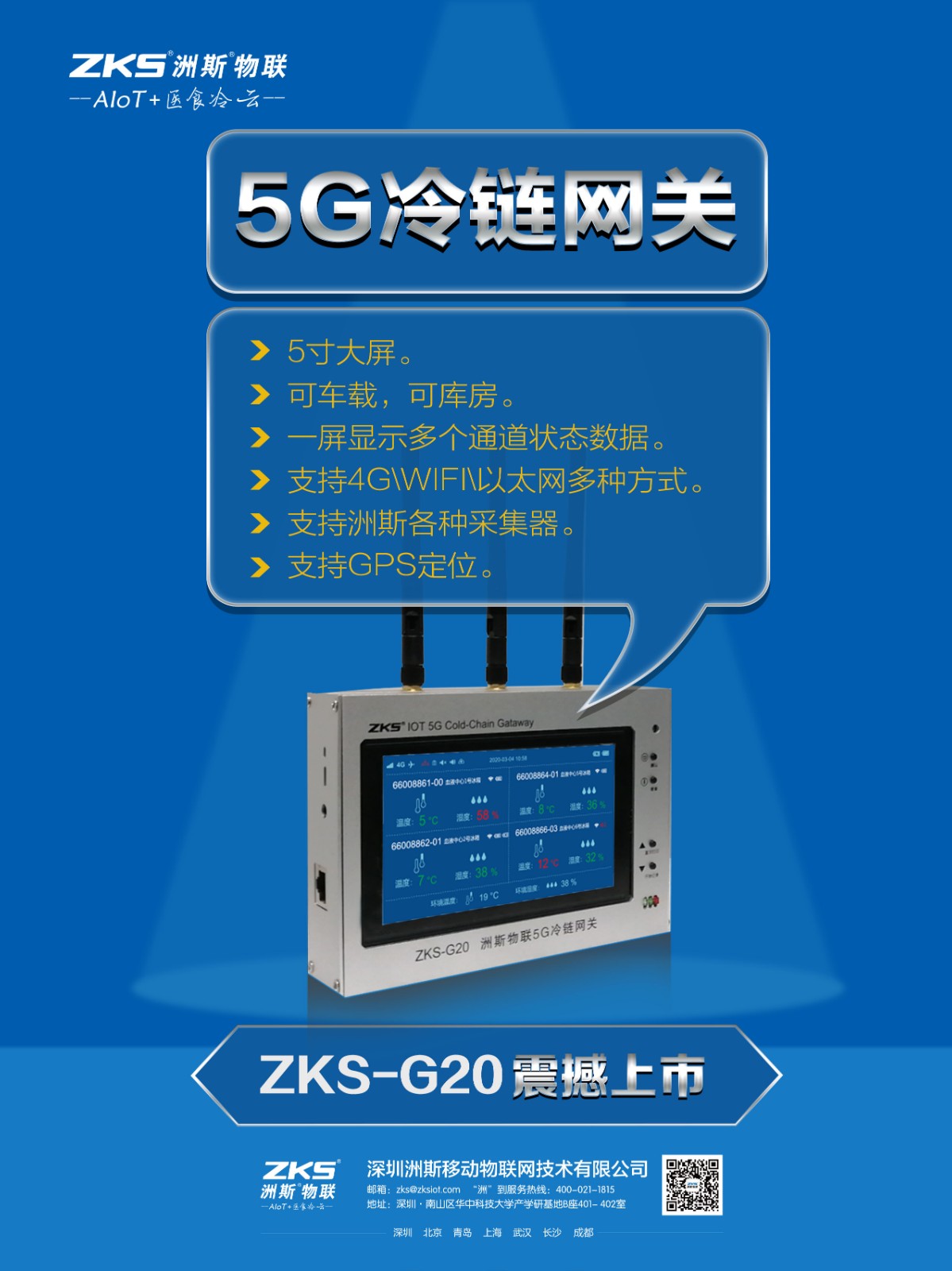LPWAN硬核科技、5寸彩屏、5G/4G/NB-IoT/WIFI選配通 訊、標配以太網口,485接口,可外接高音聲光警報器;完 美適配多種洲斯interBow無線溫濕度采集儀:智能屏顯記錄 儀S6SC or小巧型記錄儀C100。是冷鏈、冷庫、冷藏車、糧 庫、煙草、博物館、農業等溫濕度無線監控利器。